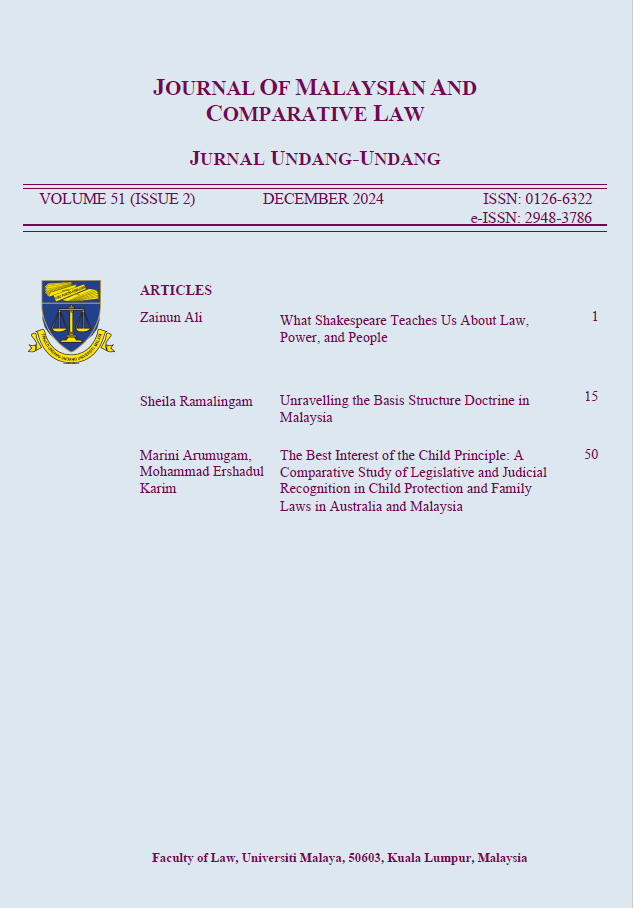 This issue of the JMCL features three articles. In the first article, “What Shakespeare Teaches Us about Law, Power, and People,” the author explores how Shakespeare’s richly layered language and the turbulent political climate of the Tudor–Stuart era reveals an enduring truth: law and power are inseparable, whether used to legitimise authority or dismantle it. Tan Sri Zainun Ali notes that every bid for control, by kings, rebels, armies, or executives, must confront the law, often by suspending or destroying it, with the legal order (including the judiciary) becoming an early target in moments of anarchy or coups. Shakespeare’s portrayal of law shifts according to the power dynamic between monarch and judiciary, reflecting a world where judges lacked true independence yet still drew legitimacy from common law and England’s ancient constitution, an echo of today’s doctrines of separation of powers and the rule of law. The author argues that Shakespeare uses his characters as mirrors, allowing us to confront our own flaws and understand universal themes of justice and power; and while his depictions of ordinary people are raw and sometimes violent, they underscore a crucial lesson: when the law serves only the powerful rather than the people, resentment breeds rebellion and disorder. Ignoring this warning, the author concludes, remains perilous for the modern legal fraternity.